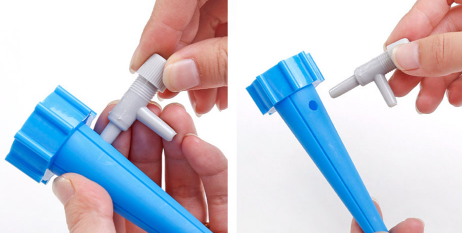 Use the product to control the water flow. Place the plastic part inside the soil and place a full bottle of water onto the plastic part. Use the regulating valve to control the amount of water that goes into the soil.