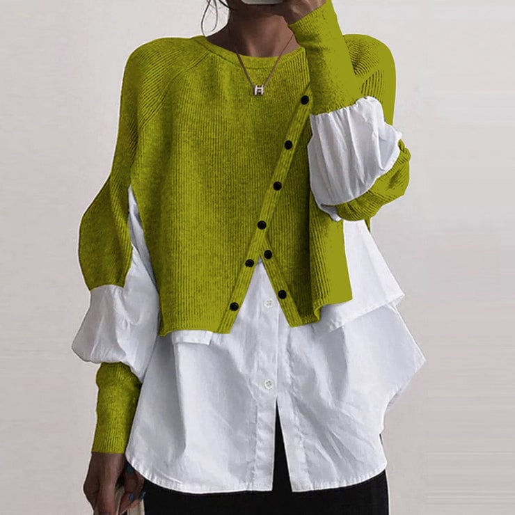 Two looks in one with our super-chic twofer sweater. A gray knitted short sweater and white blouse two-in-one design give it a layered style, perfect for wearing to work or on colder days. A faux button front adds luxe detail, always making it a statement in contemporary trends anywhere you go. Machine wash normal with light colors or hand wash. May be hung up to dry or lay flat. Light ironing if needed.