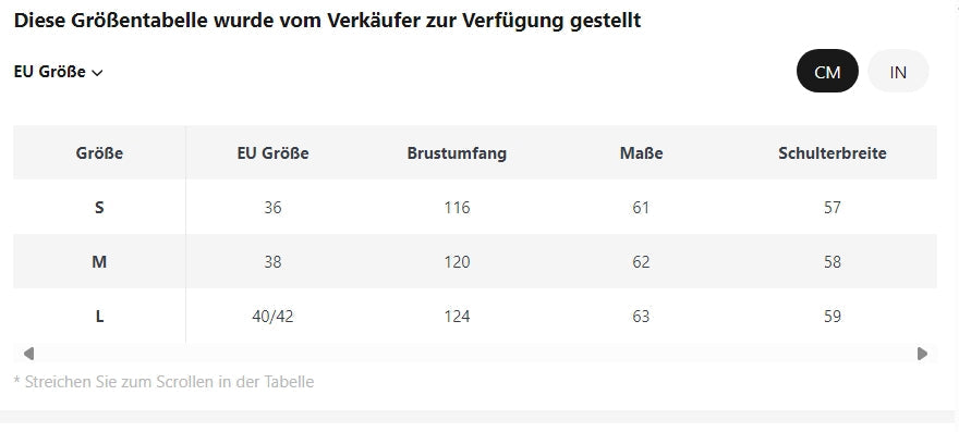 | Size | EU size | chest circumference | Mass | shoulder width |